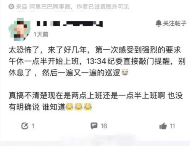阿里员工近来在搭档圈发帖称,自己午休被纪委敲门提示上班时刻到了,引发了关于阿里不同部分午休时刻是否共同的谈论。有媒体询问了阿里两个BU的员工,发现一个表明是12点到2点午休,别的一个则表明没有规则详细时刻。这表明阿里的午休方针或许因部分而异,反映出公司对上班时刻和功率的不同要求。